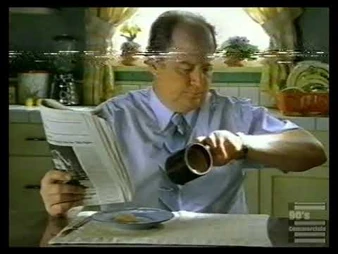 (Scene: Kitchen - a man is reading the newspaper and checks his watch while his own coffee spills all over his pants.)